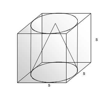 Since the bases of the cylinder and the cone both have diameters of s (the length of one side of the cube), each of their radii is s/2. Both also have a height of s. The formula for volume of a cylinder is V = πr2h The formula for volume of a cone is V = πr2h/3 If you substitute in the radius and height for both, what is the ratio of their volumes? Hope this helps, Janice | ||||||||||||