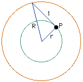 If the radius of the larger circle is R and the radius of the smaller circle is r then, looking at the figure and using the fact that the angle at P is a right angle, we can see that R^2 = r^2 + 1^2, or R^2 - r^2 = 1. The area of the annulus is given by A = pi*R^2 - pi*r^2 = pi*(R^2 - r^2) = pi. |
