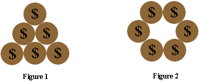 Six pennies start out in the triangular shape shown in Figure 1 below. They are to be moved into the six-sided shape as shown in Figure 2.